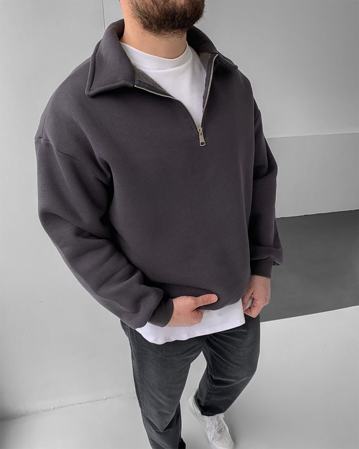 BEDEN İŞİN MESAJ ATINIZ. Fermuarlı yakası ve uzun kollu, bol kesim gri erkek sweatshirtü. Yumuşak ve sıcak kumaştan, günlük sokak stili için uygun.