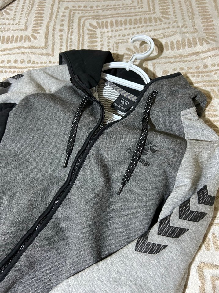 Fermuarlı, yüksek yakalı, baskılı kollu ve gri renkte, trend sokak stili için uygun, sentetik kumaştan yapılmış erkek sweatshirtü. Fermuar kısmında ki tutma yeri kırık. Yakından çektiğim fotoğrafta görünüyor.