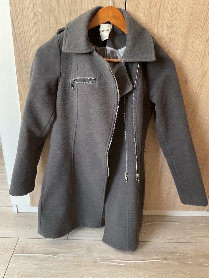 Fermuarlı, göğüs kısmında fermuarlı cep ve klasik yakalı gri kadın kaban. Soğuk havalar için şık ve sıcak bir seçenek.