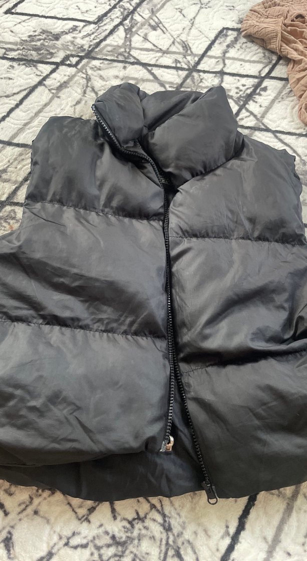 Fermuarlı ön kısmı ve yüksek yakası ile gri renkli, sentetik kumaştan yapılmış, rahat kesim şişme yelek.