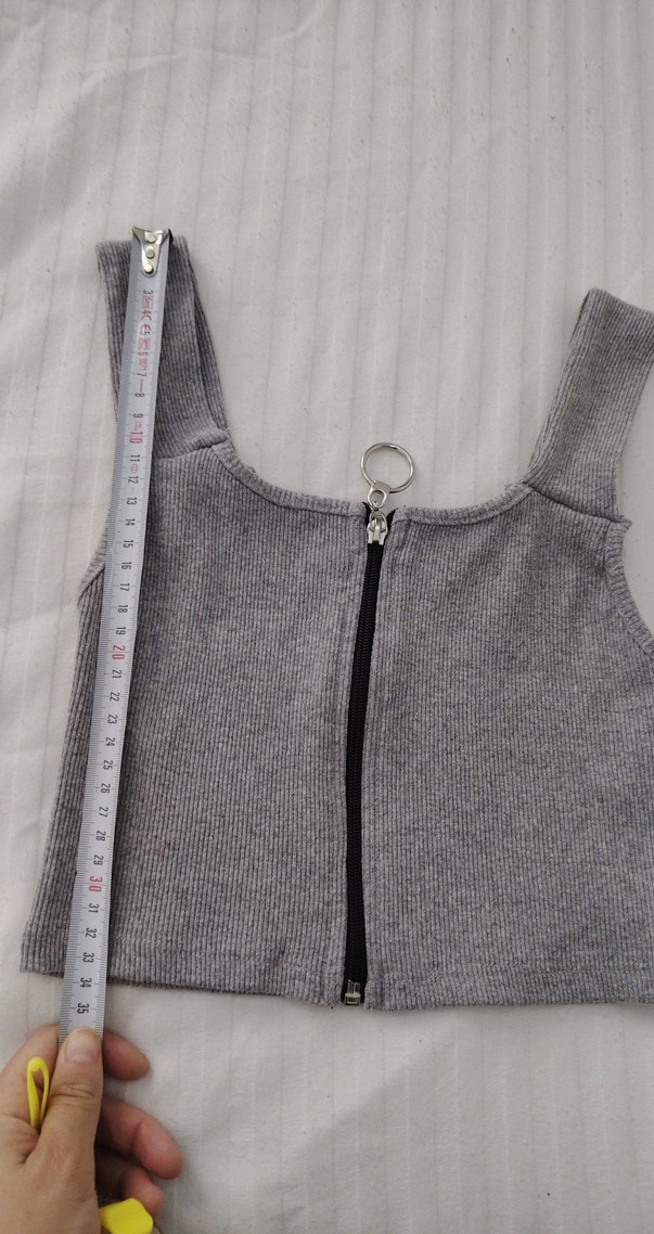 Fermuarlı, gri renkli, triko kumaştan, bisiklet yakalı, kolsuz ve normal boyda, dar kesim kadın süveter.
