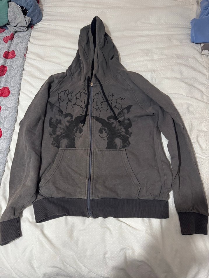 Koyu gri, fermuarlı kapüşonlu punk ceket. iplerde biraz cikinti var onun disinda temiz urun az kullanilmis
