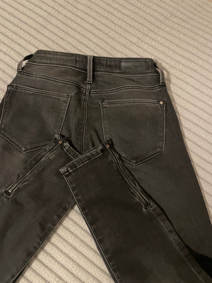 Fermuarlı detaylara sahip, normal boy gri kadın denim pantolon, günlük kullanıma uygun kesimde ve dar fit.