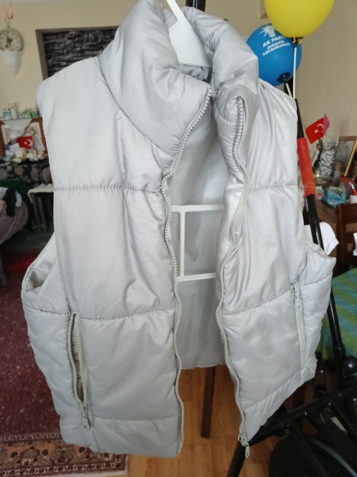 Fermuarlı cepleri ve yüksek yakası olan, yumuşak ve sıcak dokulu gri renk, kalıp olarak dar kesim, midi boyda kadın yelek. Rahat sokak stiline uygun.