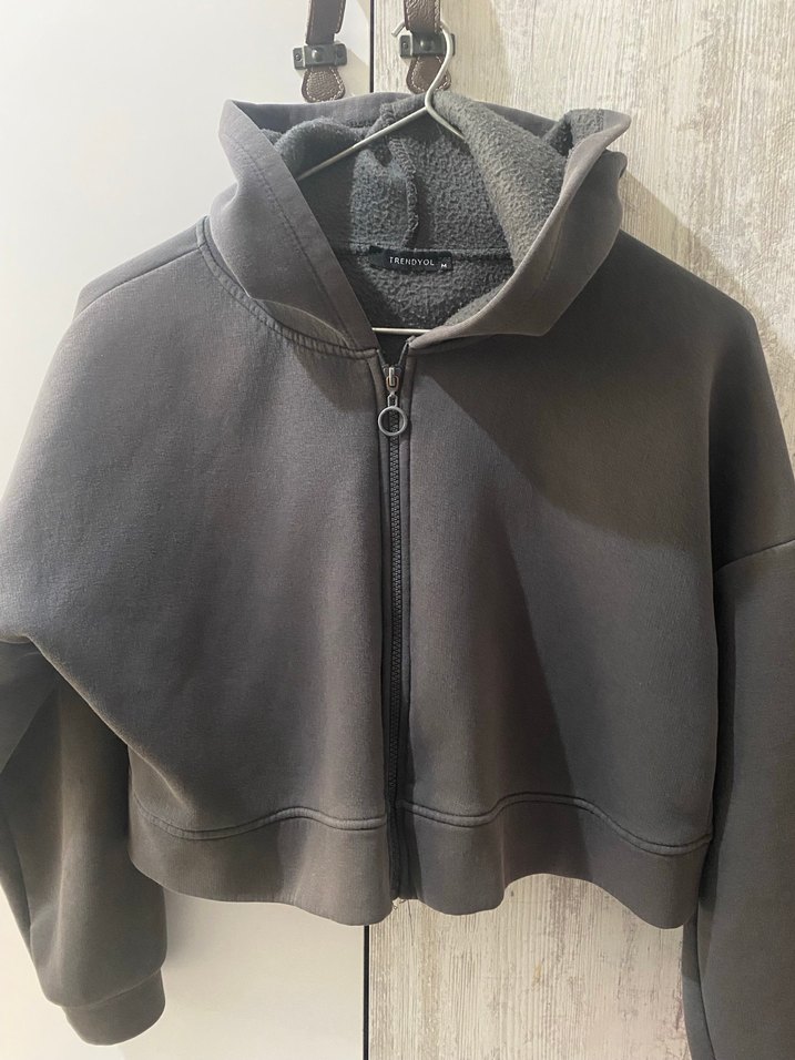 Yumuşak kumaştan yapılmış, fermuarlı ön kısmı ve uzun kollu yüksek yakalı gri sweatshirttir. Günlük kullanıma uygun rahat bir sokak stili sunar.