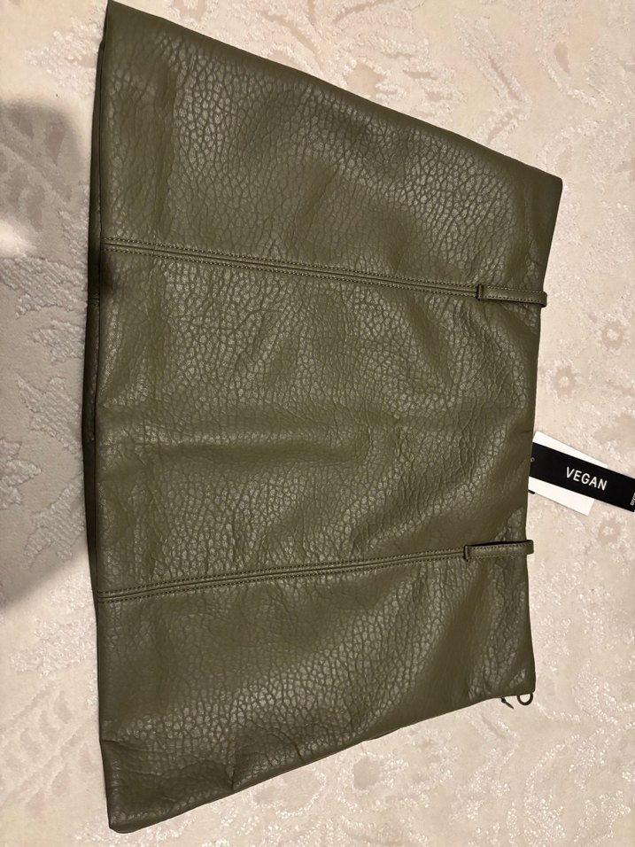 Fermuarlı kapama ve dar kesimiyle haki deri mini etek. Düz, minimalist tasarımı günlük kullanıma uygundur. Normal uzunlukta, sokak stiline uygun.