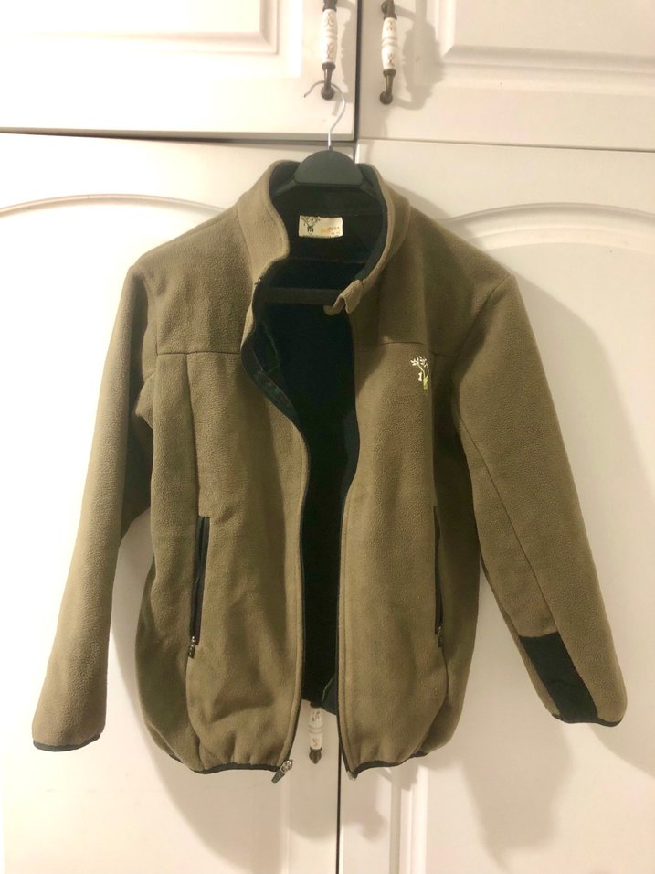 Fermuarlı cepleri ve çıtçıtlı yakası olan, haki renkte, uzun kollu ve orta boy rahat kesim erkek polar mont.