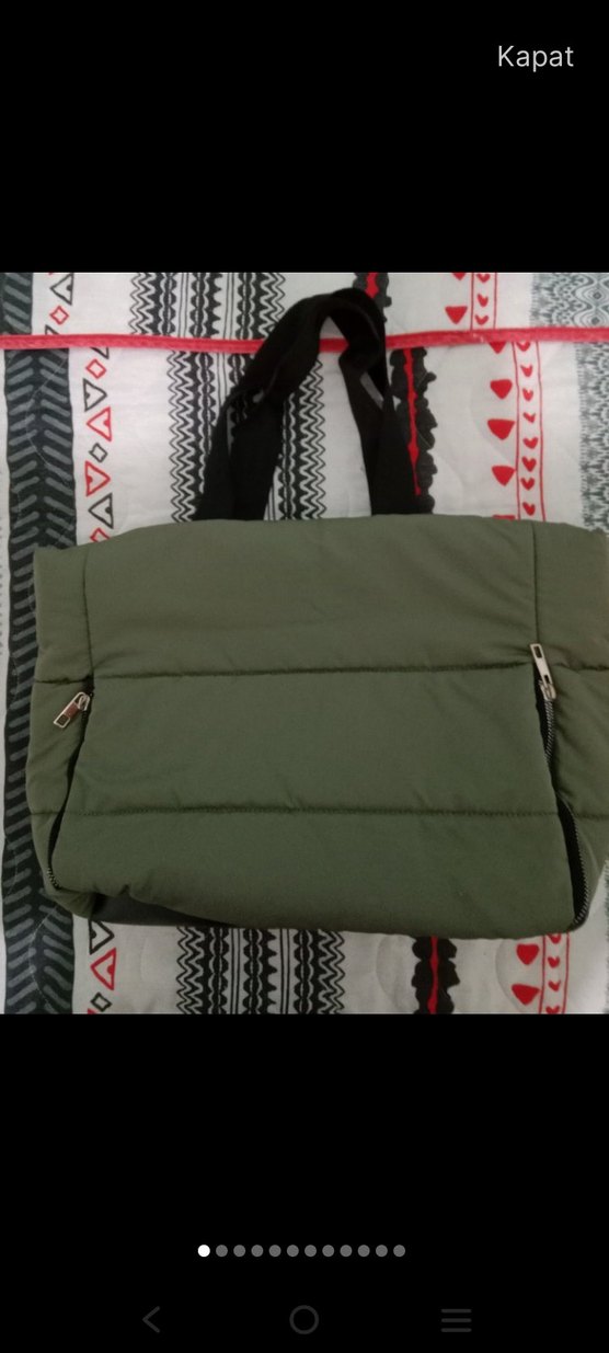Haki sentetik kumaştan, fermuarlı, rahat ve sade tasarımlı kadın omuz çantası. Günlük kullanıma uygun, sokak stiline uyumlu ve siyah saplıdır. İlk fotoğraftaki rengi esastır diğerleri ışığın etkisiyle silik çıktı. Ölçüleri; boy 30, en 47, sap 50 cm' dir ve sorunsuzdur.