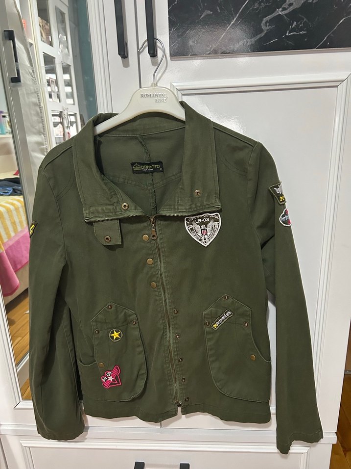 Koyu yeşil, uzun kollu, düğmeli ve nakışlı yamalarla süslenmiş, bol kesim kadın ceketi. Suni kumaştan, günlük kullanıma uygundur. S ve M bedenler için uygundur.