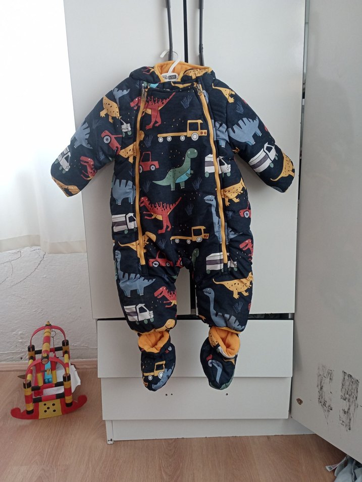 Koyu renkli, çok renkli baskılı bebek kar tulumu, fermuarlı ön ve yumuşak polar astar içerir. Sokak tarzına uygun. ❄️