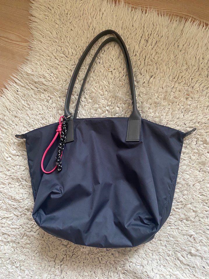 Mavi renkli, fermuarlı ve sentetik kumaştan yapılmış kadın omuz çantası. Gri sapları ve pembe aksesuarı ile günlük kullanıma uygun, desen içermeyen şık tasarım.