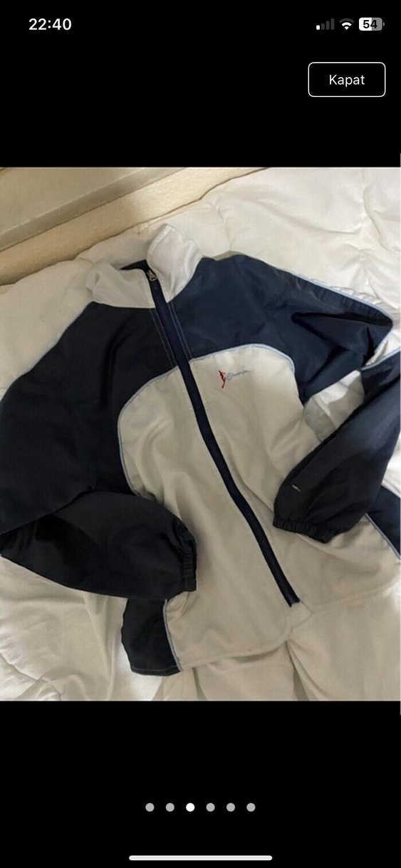 Fermuarlı, uzun kollu, oturaklı kesim mont. Sentetik kumaştan, beyaz ve koyu lacivert renklerde, spor ve sokak stiline uygun