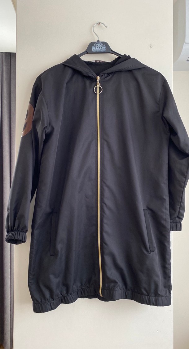 Siyah midi uzunlukta, uzun kollu kadın yağmurluk. Sentetik kumaştan, ön fermuarlı, spor ve sokak stiline uygun. Ürün boyu 78 cm