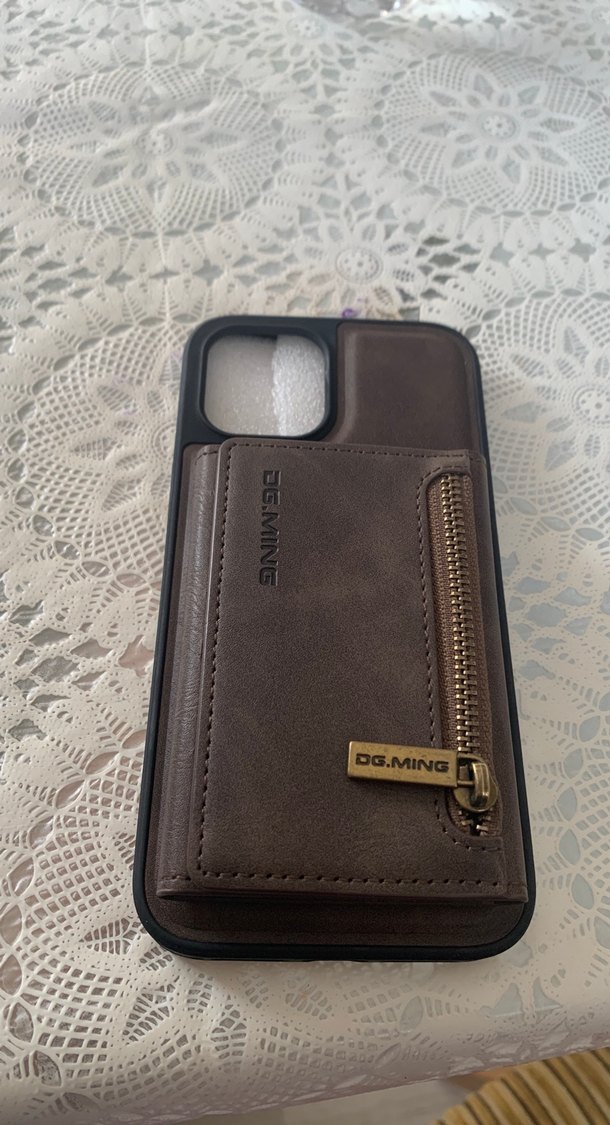 Koyu kahverengi bohem tarzda, fermuarlı cepli ve DG.MING markalı deri IPhone 12 Pro telefon kılıfı, koruma ve saklama sağlar. Kartlı