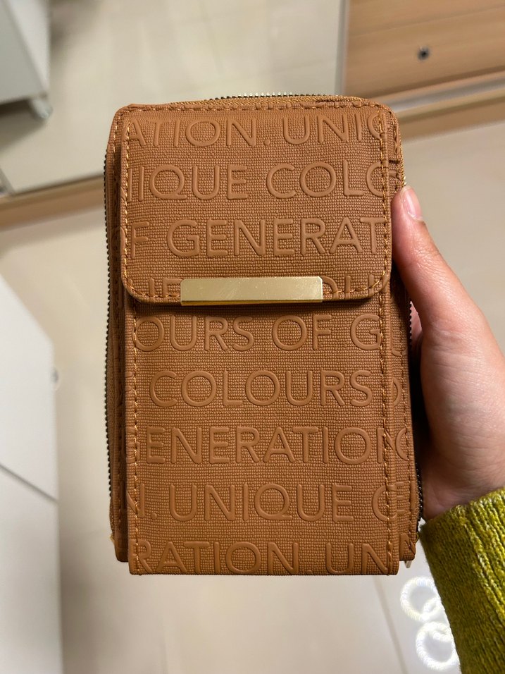 Bu açık kahverengi deri çapraz çanta, baskılı desen ve fermuarlı kapanışa sahiptir. Trendy günlük ve sokak stiline uygundur. Kabartmalı yazı detaylarıyla dikkat çeker. Hiç kullanılmadı