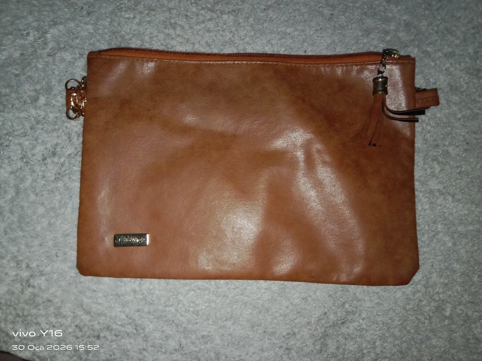 Kahverengi deri, parlak yüzeyli ve fermuarlı kapamalı kadın portföy çanta. Minimalist ve bohem tarzda, ofis için uygun sade ve desensiz tasarım.