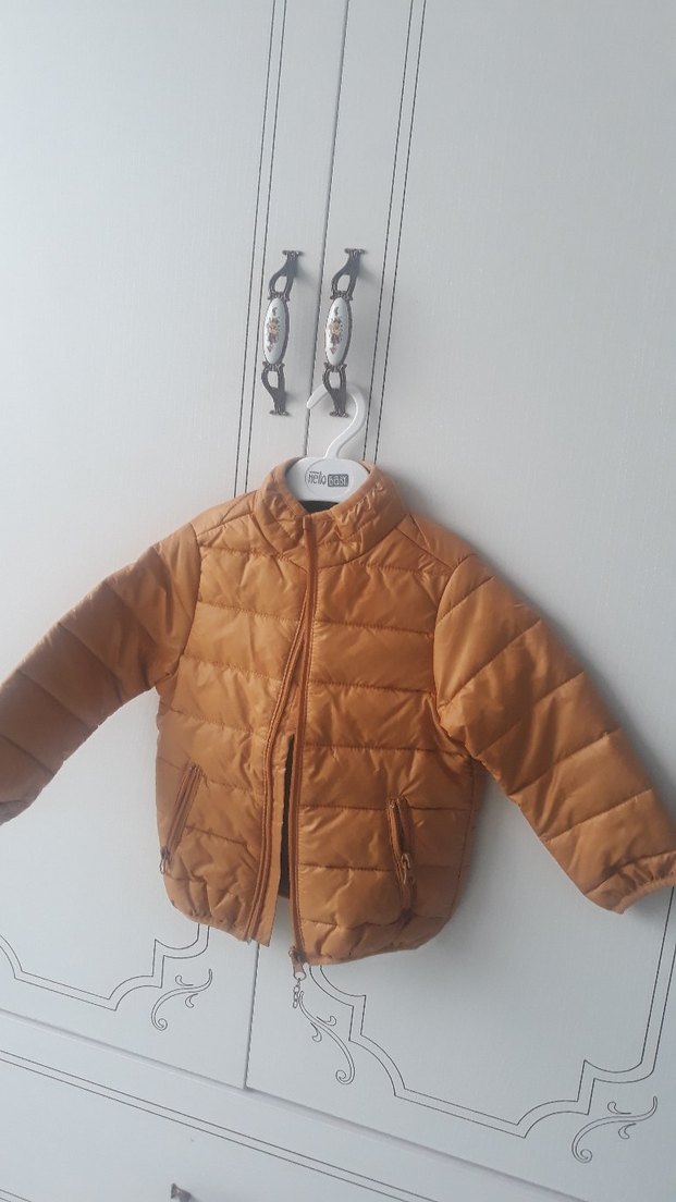 yeni bi kez giyildi küçük geldi.parlak kahverengi, fitted kesim erkek çocuk mont. Yumuşak ve sıcak dokulu kumaştan üretilmiştir.