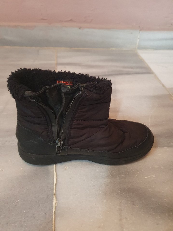 siyah cocuk botları, dolgu topuk ve fermuarlı tasarıma sahiptir. Kauçuk malzemeden üretilmiş olup iç kısmı sıcak tutar.
