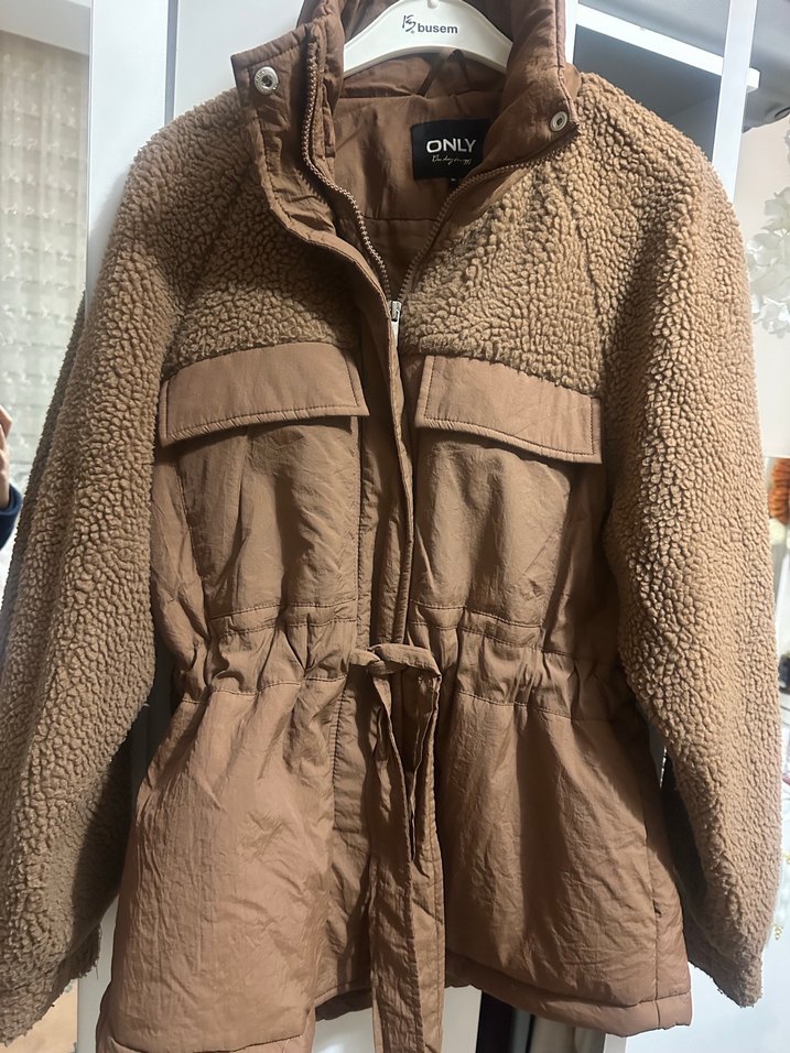 Kahverengi, kürklü detaylı üst kısmı yumuşak kumaşlı, bol kesim ve çıtçıtlı yakalı kadın kış montu. Ayarlanabilir bağcıklı bel ve midi boy, günlük rahat stil için uygundur. Marka: ONLY. ❄️
