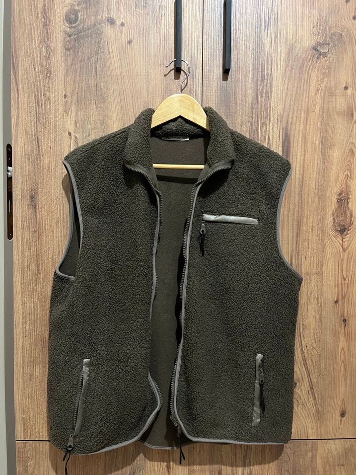 Fermuarlı cepleri ve yüksek yakası olan, kahverengi yumuşak polar kumaştan yapılmış, normal boy yelek. Günlük rahat sokak stili için uygundur.
