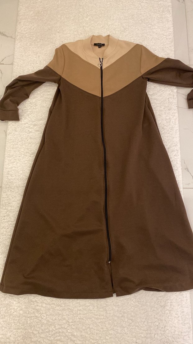 Fermuarlı önü ve kesik yaka detaylı, uzun boylu, kahverengi tonlarında, yumuşak ve sıcak dokulu fitted kabanı.
