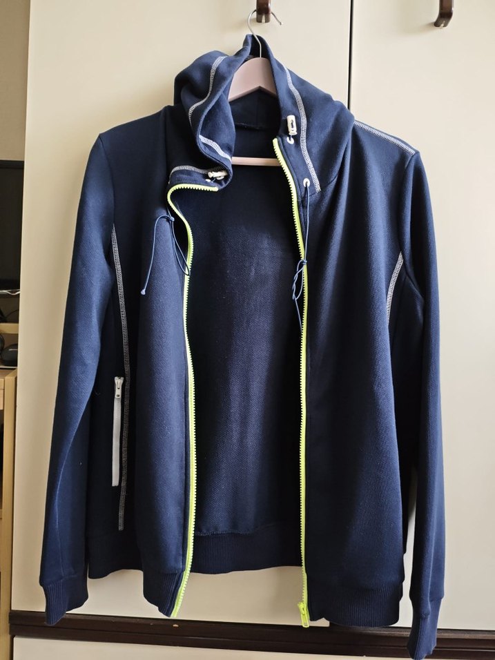 Kapşonlu, uzun kollu, yumuşak fleece kumaştan yapılmış sweatshirt. Fitted kesim, fermuarlı cepler ve ön fermuar bulunur. Sokak stili ve günlük kullanım için uygundur. Renk Lacivert Beden S-M uyumlu