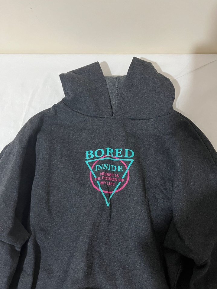 Fermuarlı ve kapüşonlu, yumuşak kumaştan yapılmış, dar kesim gri sweatshirt. Uzun kollu ve önünde "BORED INSIDE" baskısı bulunur. Spor ve sokak stili için uygundur.