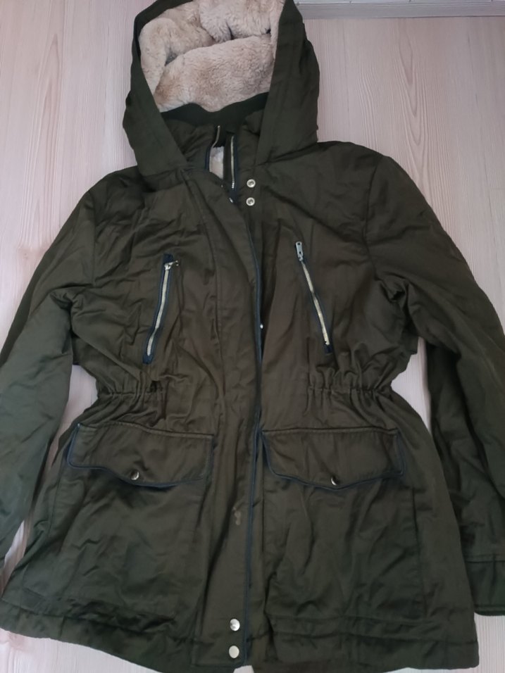 Fermuarlı, kapüşonlu ve uzun kollu bu kadın mont yumuşak kürk astarlı ve midi boydadır. asker yeşili rengindedir sokak stili için uygundur uzunluğu 65 cm'dir 2 kol arası fermuar kapalıyken 55 cm'dir resimde gösterdiğim yerde hafif bir deformesi vardır başka hiçbir deformesi yoktur