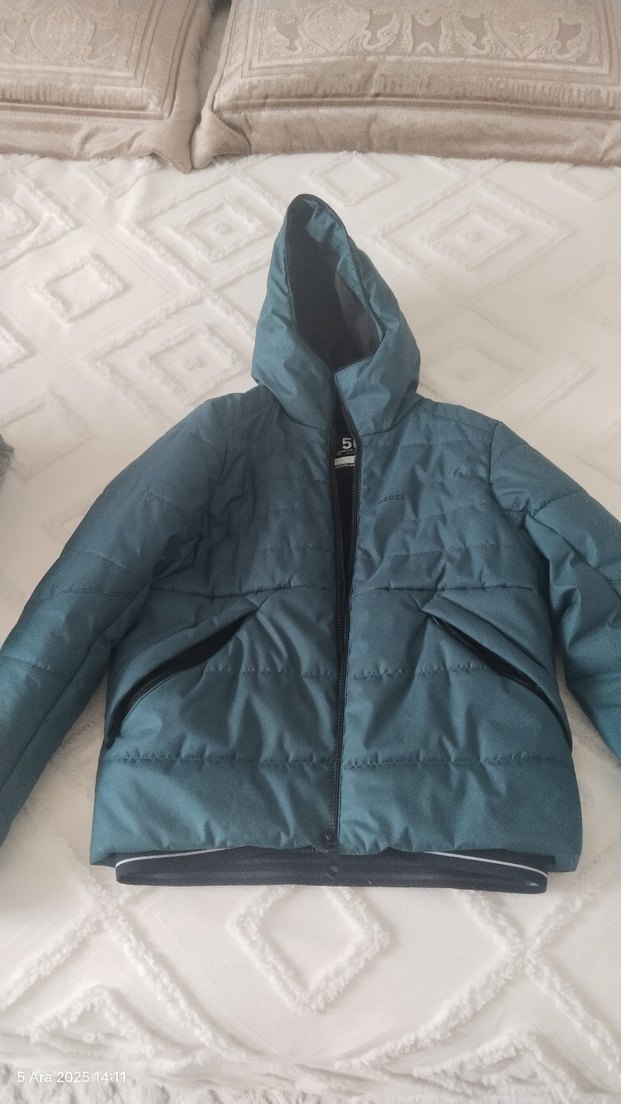 Yumuşak ve sıcak kumaştan yapılmış, fermuarlı önü ve uzun kollu, kısa kesim mavi mont. Notlu yaka ve rahat, sokak stili tasarıma sahiptir.