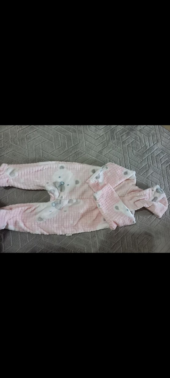 Kapüşonlu, pastel pembe bebek tulumu. Yumuşak ve konforlu kumaş, hafif ayı deseniyle.