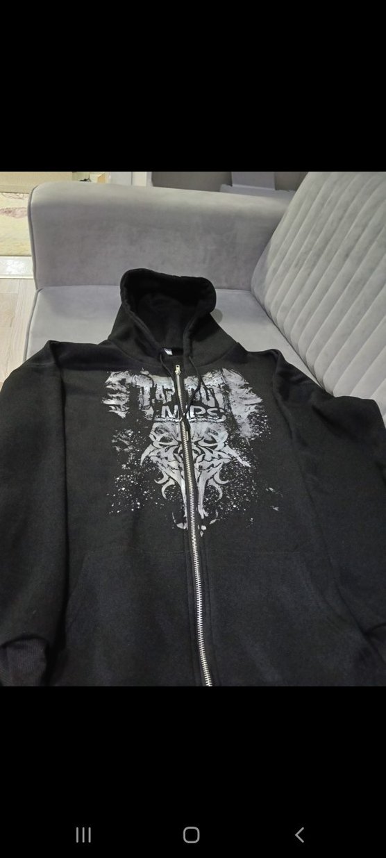 Fermuarlı önü ve kapüşonlu siyah, yumuşak ve sıcak kumaştan yapılmış fitted gotik sweatshirt. Önünde baskılı gotik desen, uzun kollu ve normal midi boyda, açık hava için uygun.