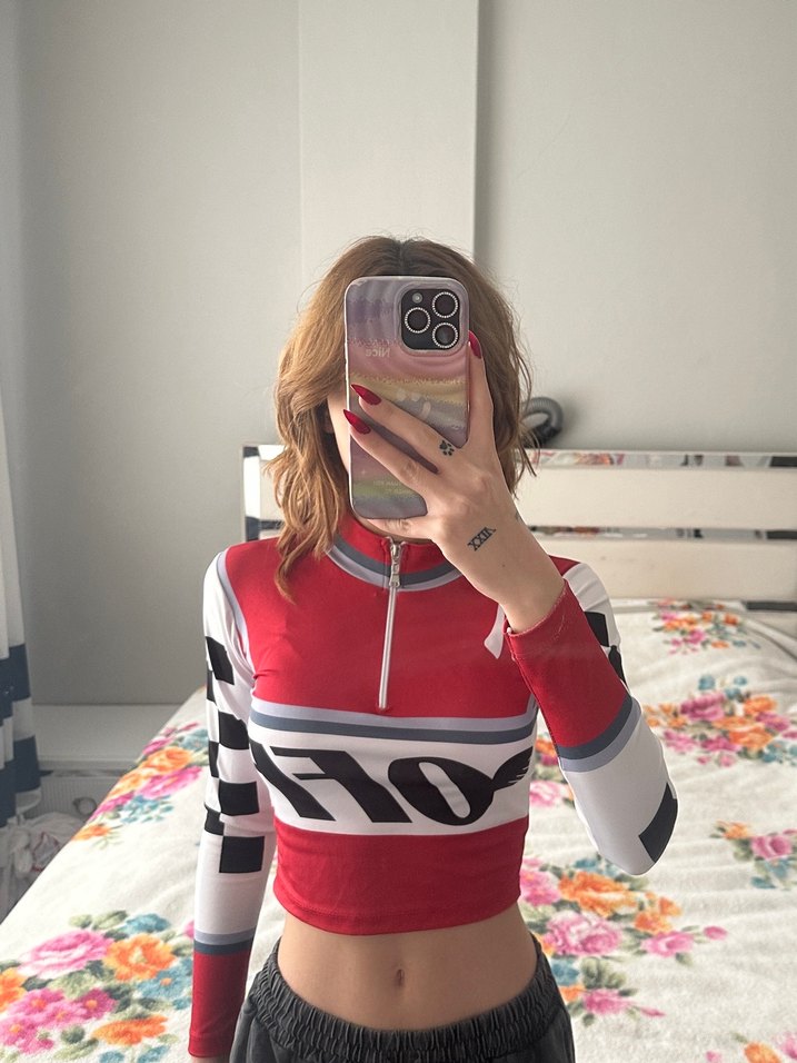Fermuarlı ön kısmı ve yüksek yakası olan, uzun kollu kırmızı baskılı fitted sweatshirt. Yumuşak ve sıcak kumaştan üretilmiştir.