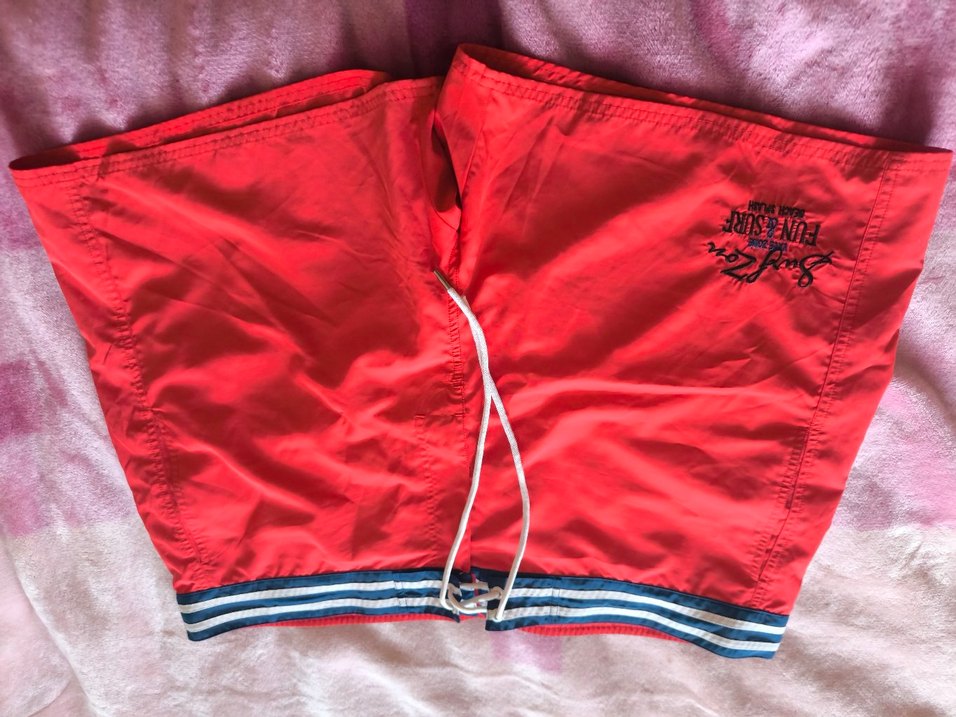 Parlak kırmızı, fermuarlı ve vücuda oturan midi uzunlukta erkek yüzme şortu. Çizgili bel bandı bulunur. Plaj ve günlük sokak giyimine uygundur.