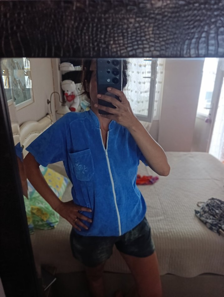Fermuarlı, kısa kollu, yakalı mini gömlek. Koyu mavi havlu. havuz deniz sonrasi için çok rahat sokak stili için uygundur.