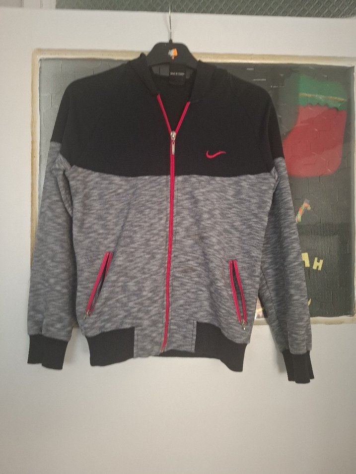 Bu fermuarlı eşofman üstü gri siyah ve pembe olup fermuari sağlam. kapüşonlu cepli.
