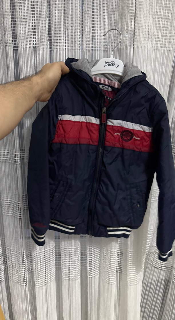 Erkek çocuklar için fermuarlı, fitted kesim, notched lapel yakalı ve yumuşak iç astarlı koyu gri ceket. Göğüs kısmında kırmızı ve beyaz şeritler bulunur.