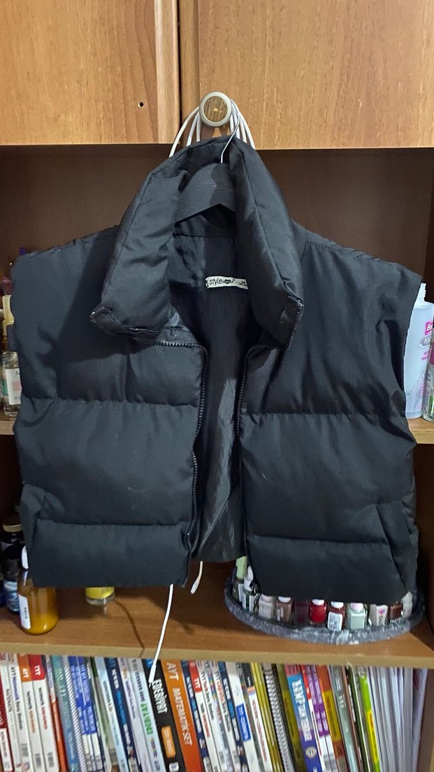 Fermuarlı ve yakalı, koyu gri renkte, yumuşak ve sıcak kumaştan yapılmış, normal boy ve dar kesim kadın yeleği. Sokak stiline uygun casual parça.