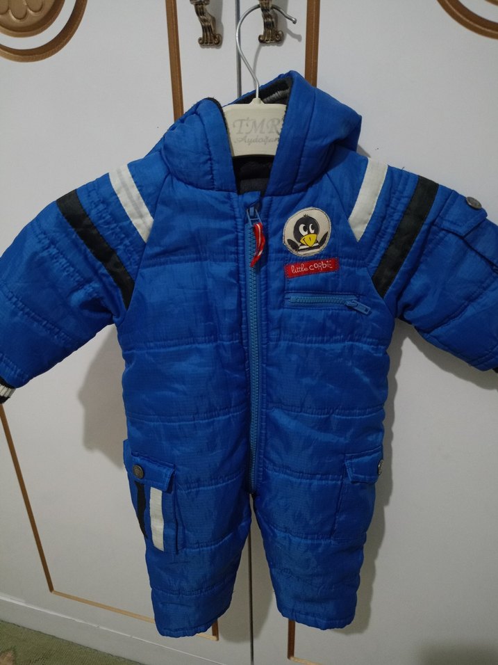 Koyu mavi renkli, fermuarlı ve baskılı detaylara sahip erkek bebek tulumu, sıcak tutan yumuşak kumaftan üretilmiştir. 3 6 aylık bebek için uygundur