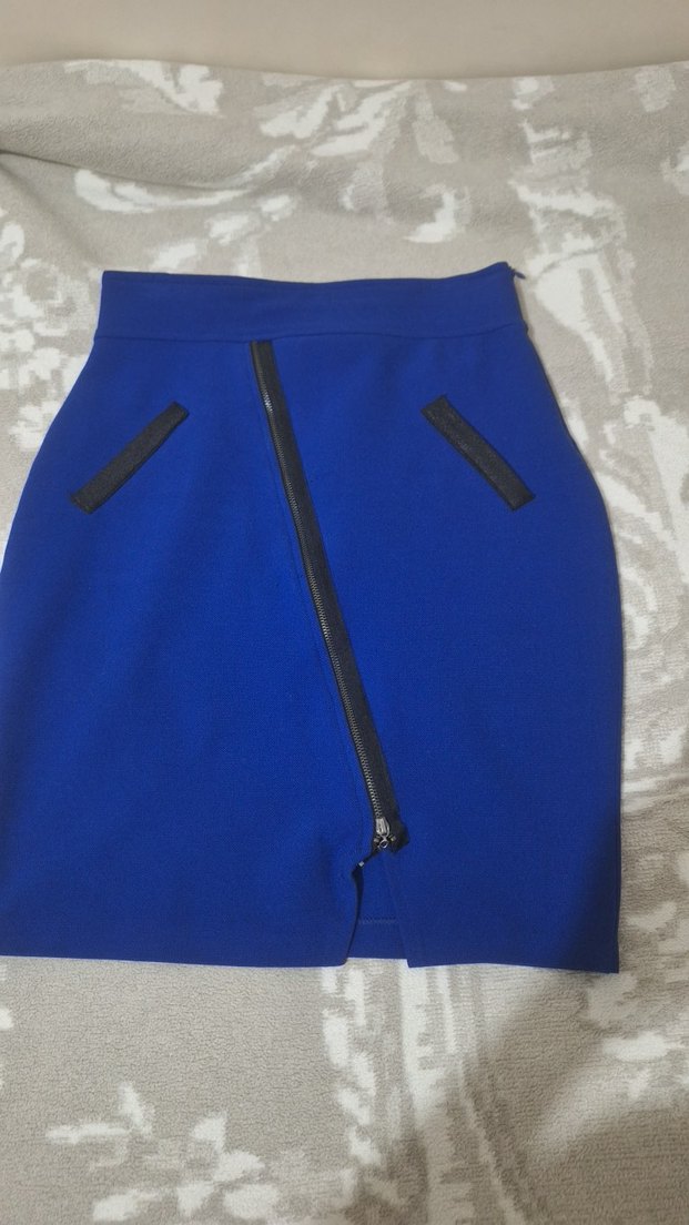 Koyu mavi renkte, önden çapraz fermuarlı ve iki fermuarlı cepli, yumuşak ve sıcak kumaştan yapılmış dar kesim mini etek. Sokak stili için uygun. JUMENT MARKASİ 55 kiloya kadar uyar