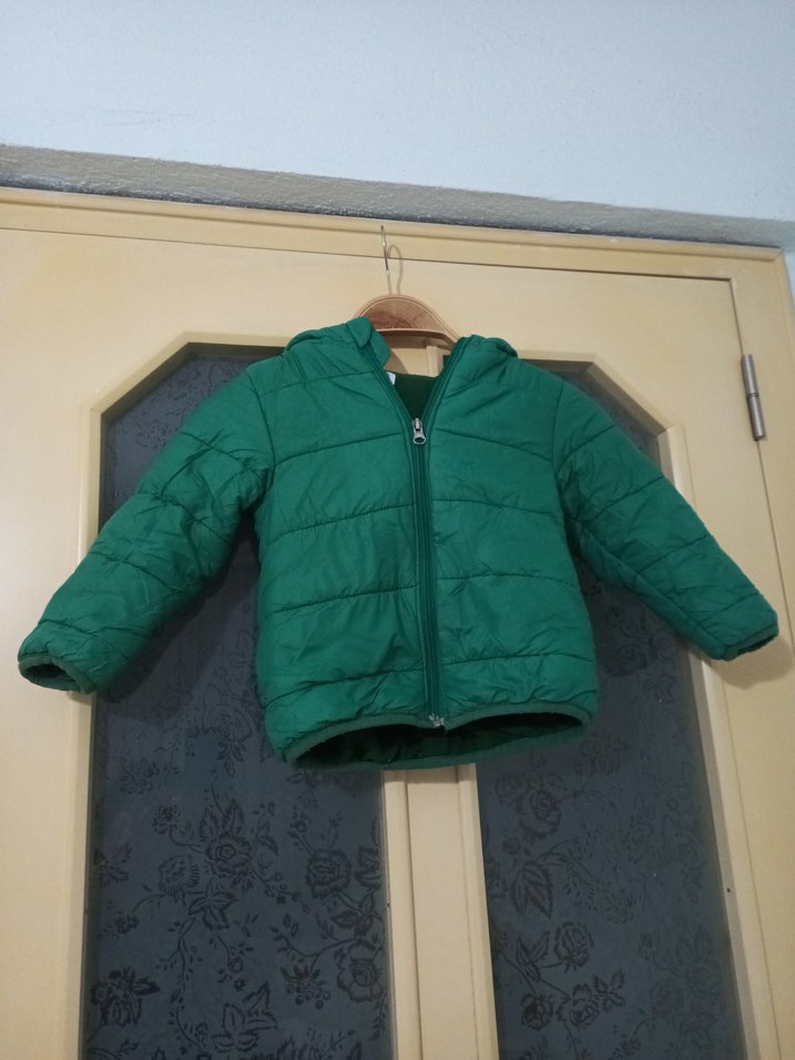 Fermuarlı, notched lapel yakalı, koyu yeşil renkli, düz desenli, erkek çocuk montu. Yumuşak ve sıcak kumaştan üretilmiştir. iki koltuk arası 34 cm boyu 37 cm