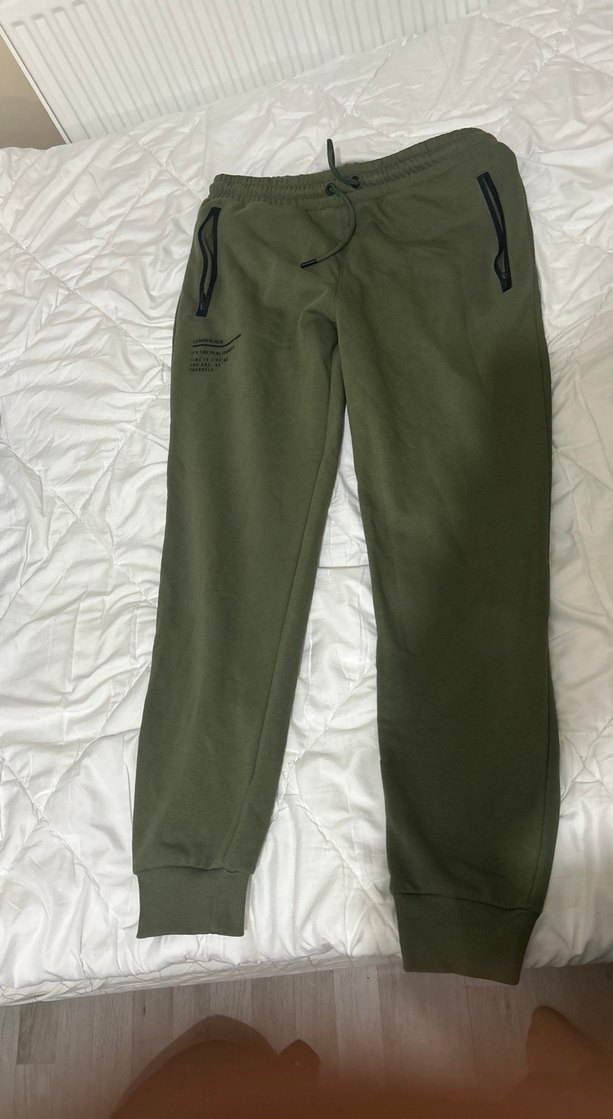 Fermuarlı cepleri ve yumuşak, sıcak kumaşıyla koyu yeşil, dar kesim erkek sweatpant. Günlük kullanıma uygundur. ♂️