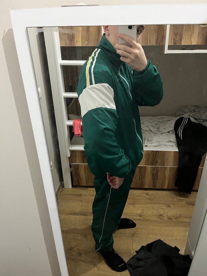Fermuarlı, koyu yeşil renkli eşofman takımı, uzun kollu ve normal boyda, yumuşak kumaştan, sportif ve rahat bir stil sunar. Çok iyi durumdadır ikiside XL.