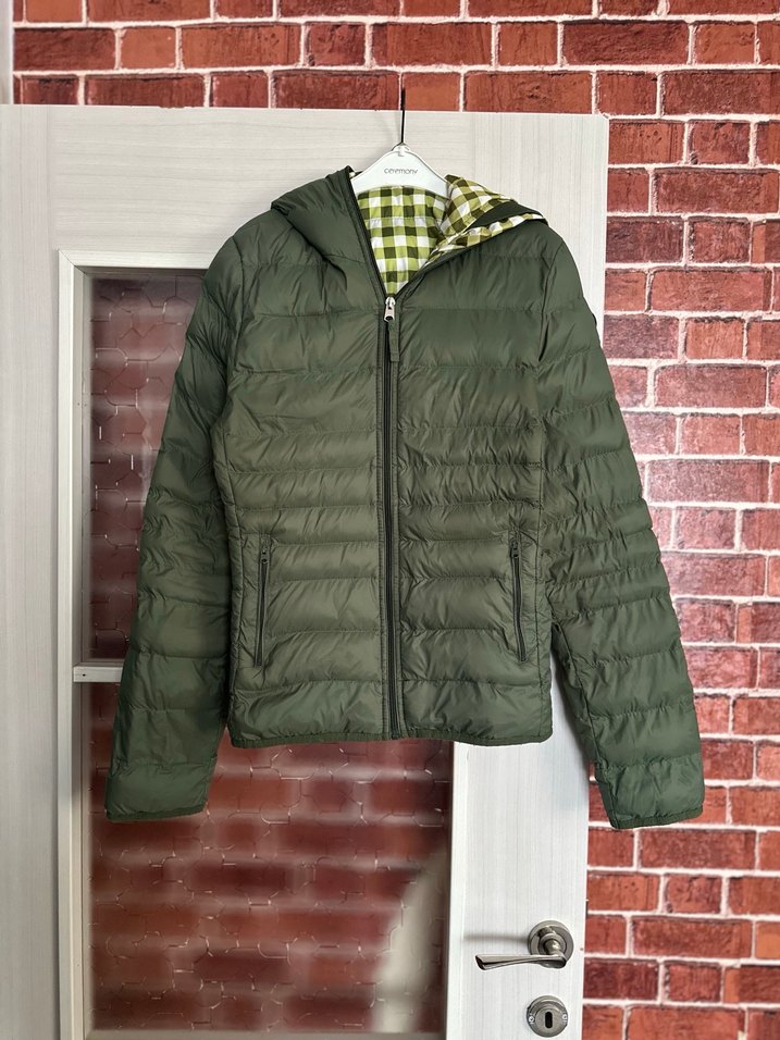 Fermuarlı, koyu yeşil kadın kışlık ceket. Uzun kollu, kesimi vücuda oturan ve içi kareli desenli sentetik kumaşla kaplıdır. Midi boyda, günlük kullanıma uygundur. ❄️