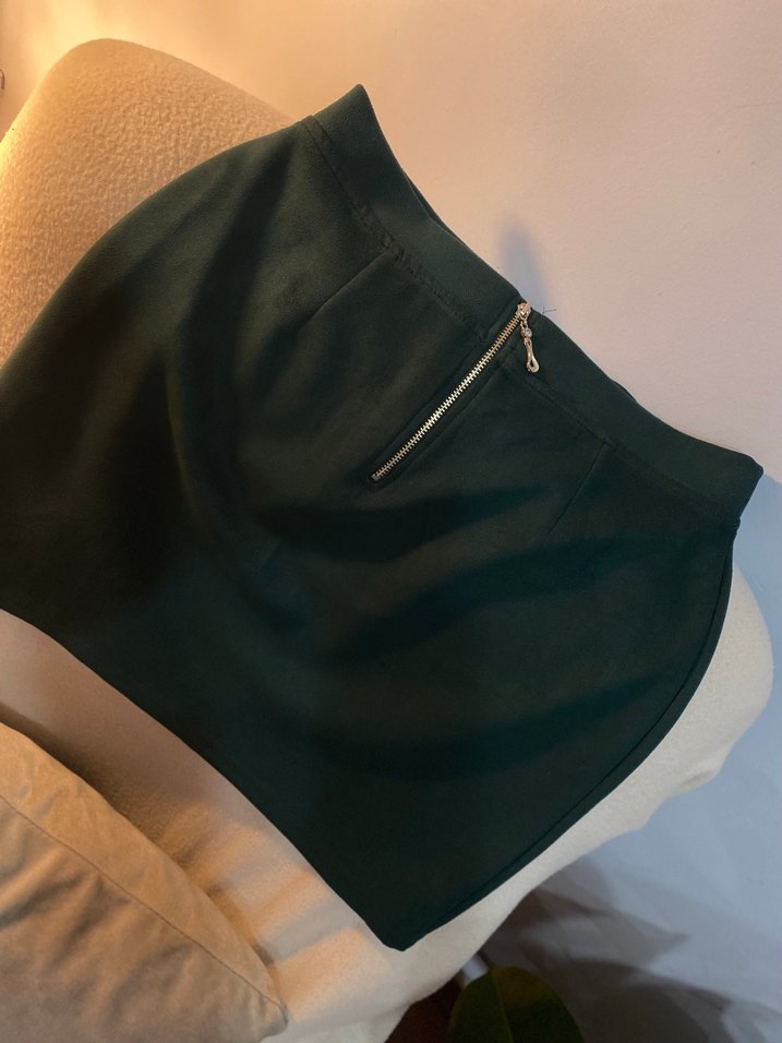 Fermuarlı detaylı, koyu yeşil süet mini etek, minimal ve sokak stiline uygun, günlük kullanıma elverişli.