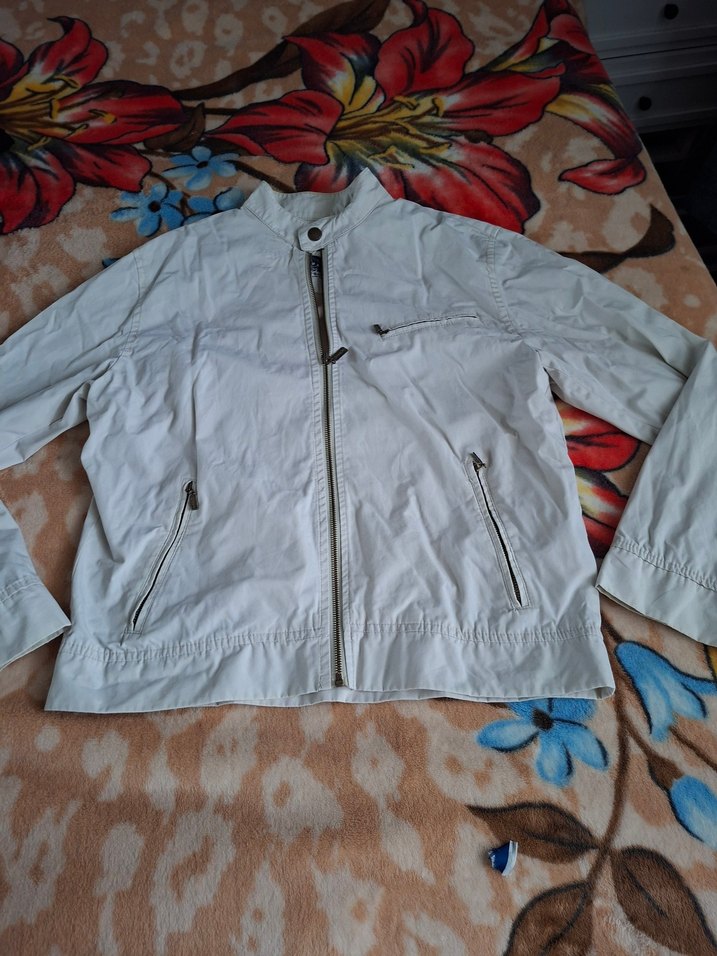 Fermuarlı cepleri ve yakalı uzun kollu krem keten ceket, günlük dış mekan kullanımı için uygundur.