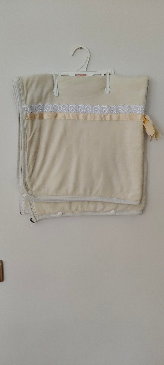 Yumuşak açık sarı çocuk battaniyesi, temizdir. ️fermuar ve çıt çıtları ile kundak haline gelebiliyor açık olarak da kullanılabilir en 81 cm boy 83 cm sadece fermuarında boya sıyrılması var.