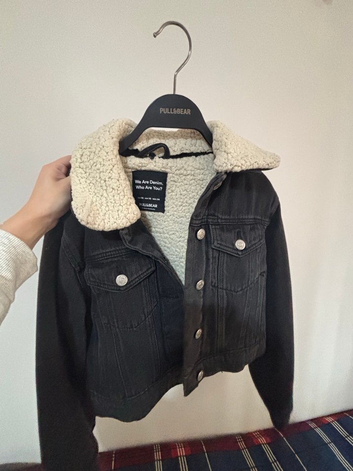 Siyah, fitted kesim uzun kollu denim ceket, kürk detaylı notched lapel yakaya sahiptir. Günlük kullanım için uygundur ve baskılı desene sahiptir. Marka: PULL&BEAR.