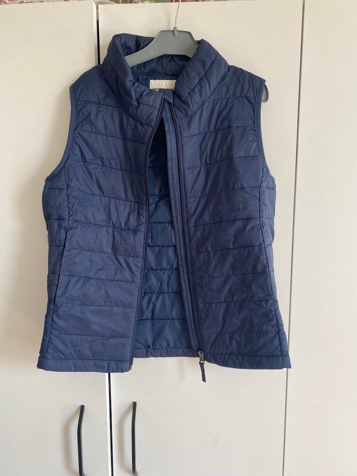 Fermuarlı, yüksek yakalı, kolsuz lacivert yelek. Sentetik kumaştan, dar kesim ve normal boyda, günlük rahat kullanıma uygun.