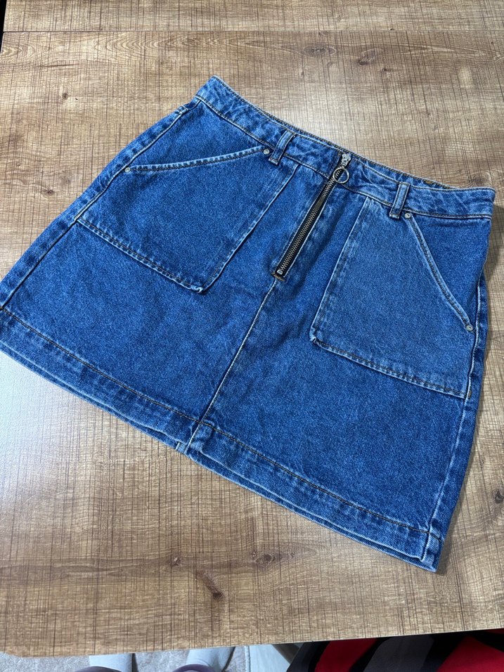 Ön fermuarlı, büyük cepli ve bol kesimli lacivert denim mini etek. Günlük kullanım için rahat sokak stili.