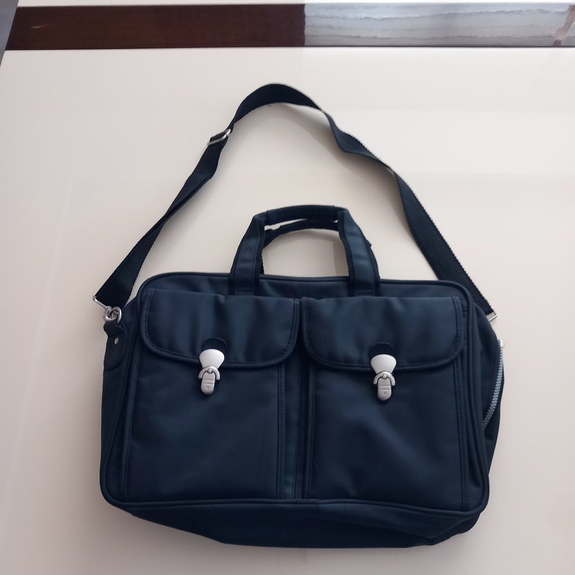 Fermuarlı bölmeleri ve çift ön cepleri olan koyu lacivert erkek evrak çantası, ayarlanabilir omuz askısı ve saplara sahiptir. ölçuleri 41 e 28